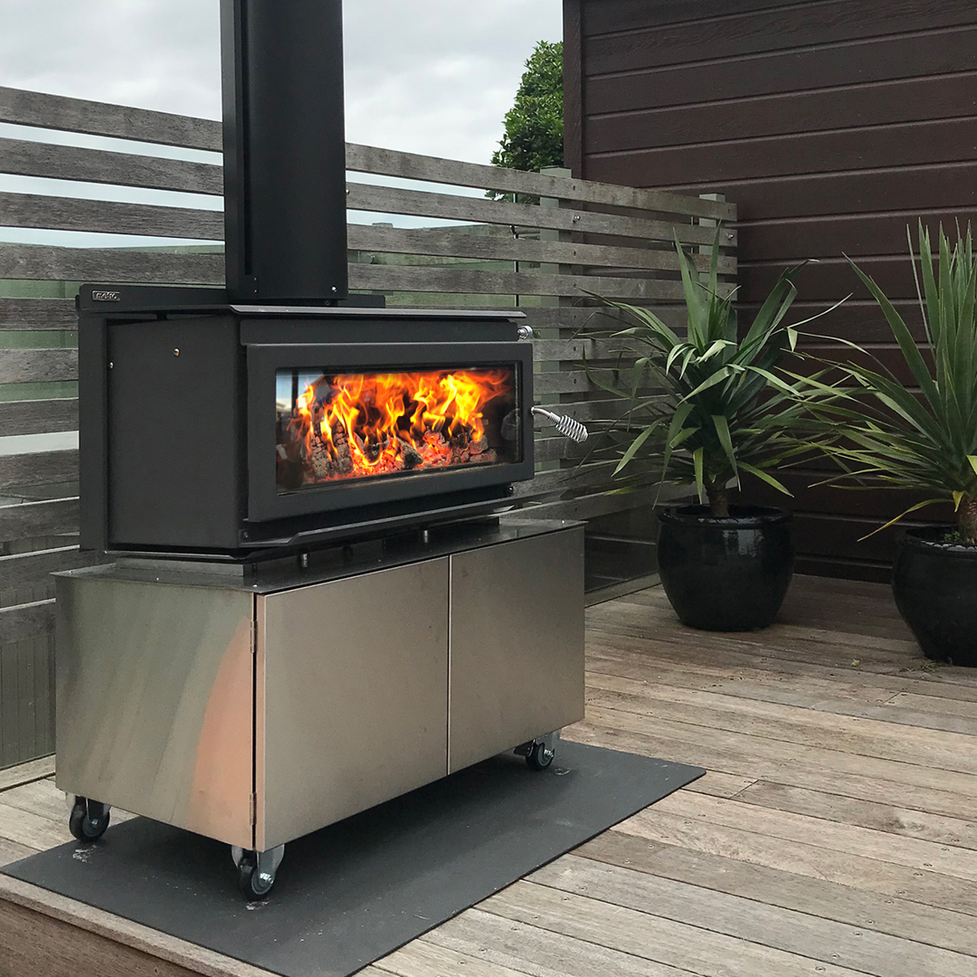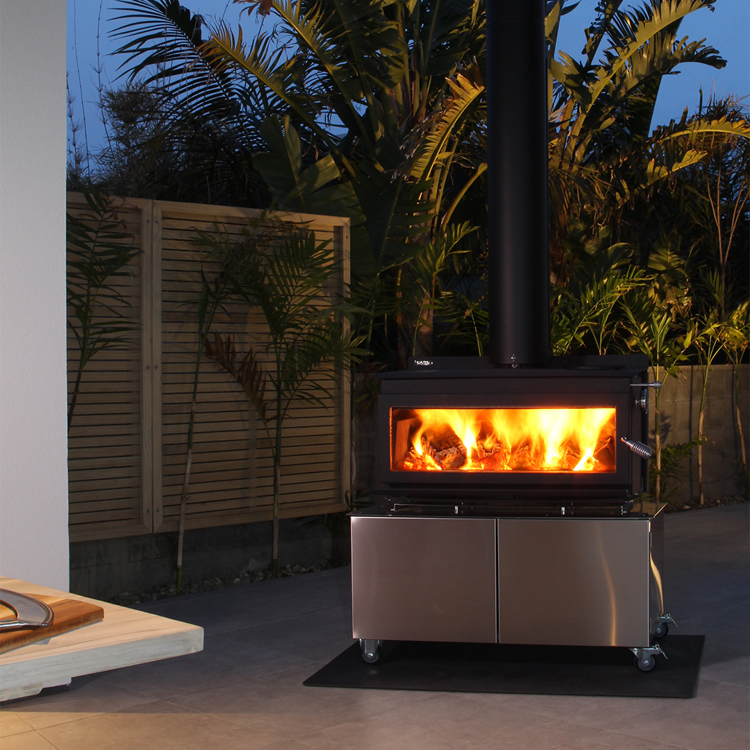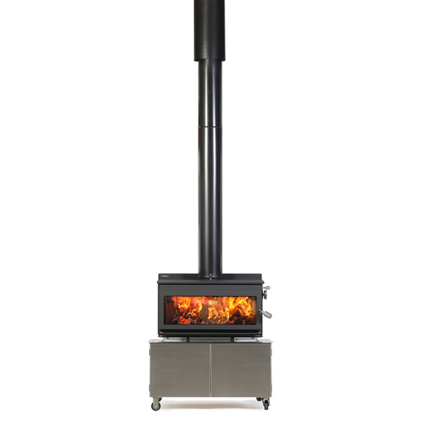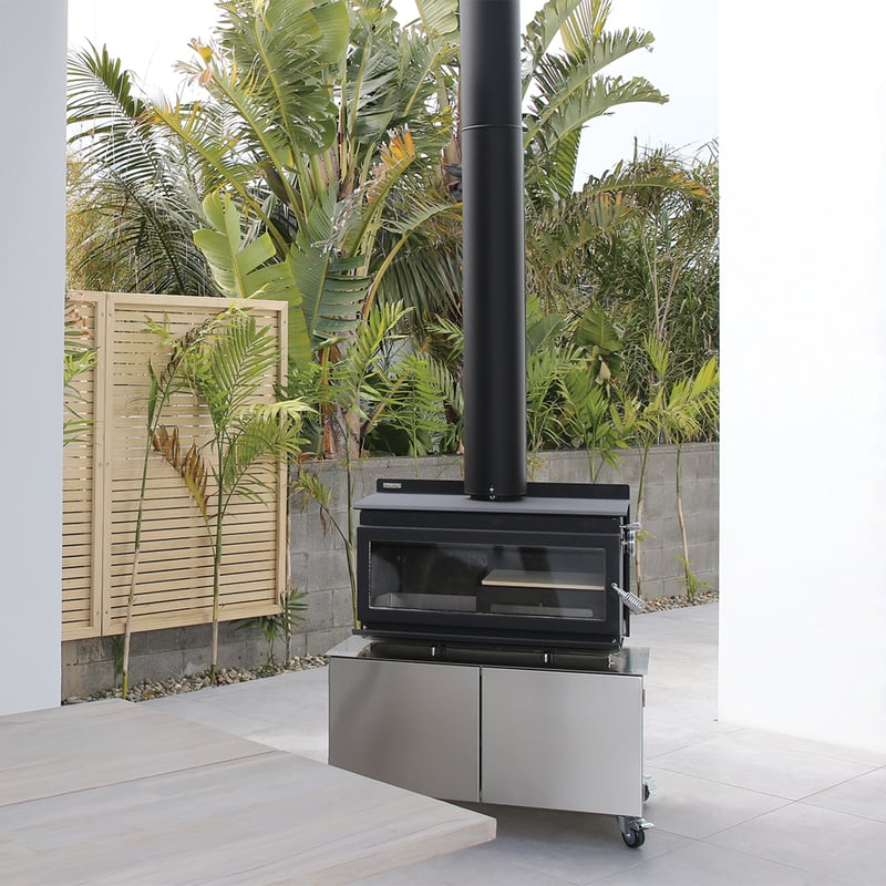 The 850-T features a large volume stainless steel storage trolley with a removable base panel for easy cleaning. Practical and convenient storage for your firewood, cooking grill and pizza stone. Heavy duty braked castors provide secure placement and the flexibility to move the unit around your outdoor living area. Landscape door glass offers panoramic fireside views, safety during operation and eliminates wind blown ash and smoke nuisance often found with open outdoor fires. The closed-door brick lined firebox delivers impressive radiant heat to your outdoor living area.